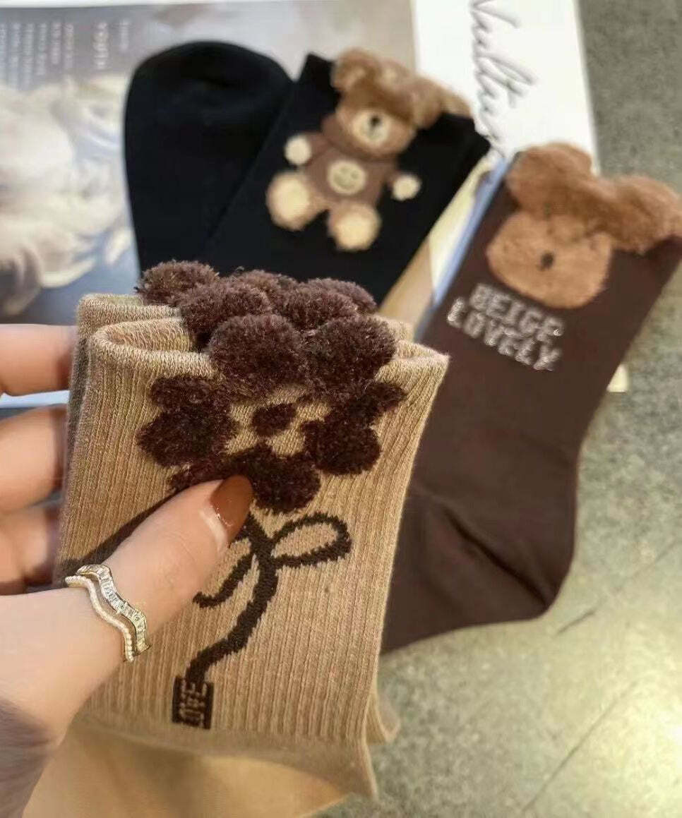 Cute Teddy Cartoon Jacquard Cotton Mid Calf Socks